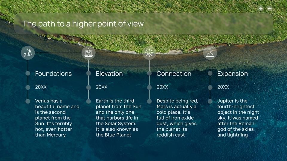 Inspiración en Slidesgo. En la plantilla «Paisajes con drones», las vistas aéreas que se utilizan como fondo contextualizan cada fase y convierten una secuencia simple en un recorrido cohesionado.