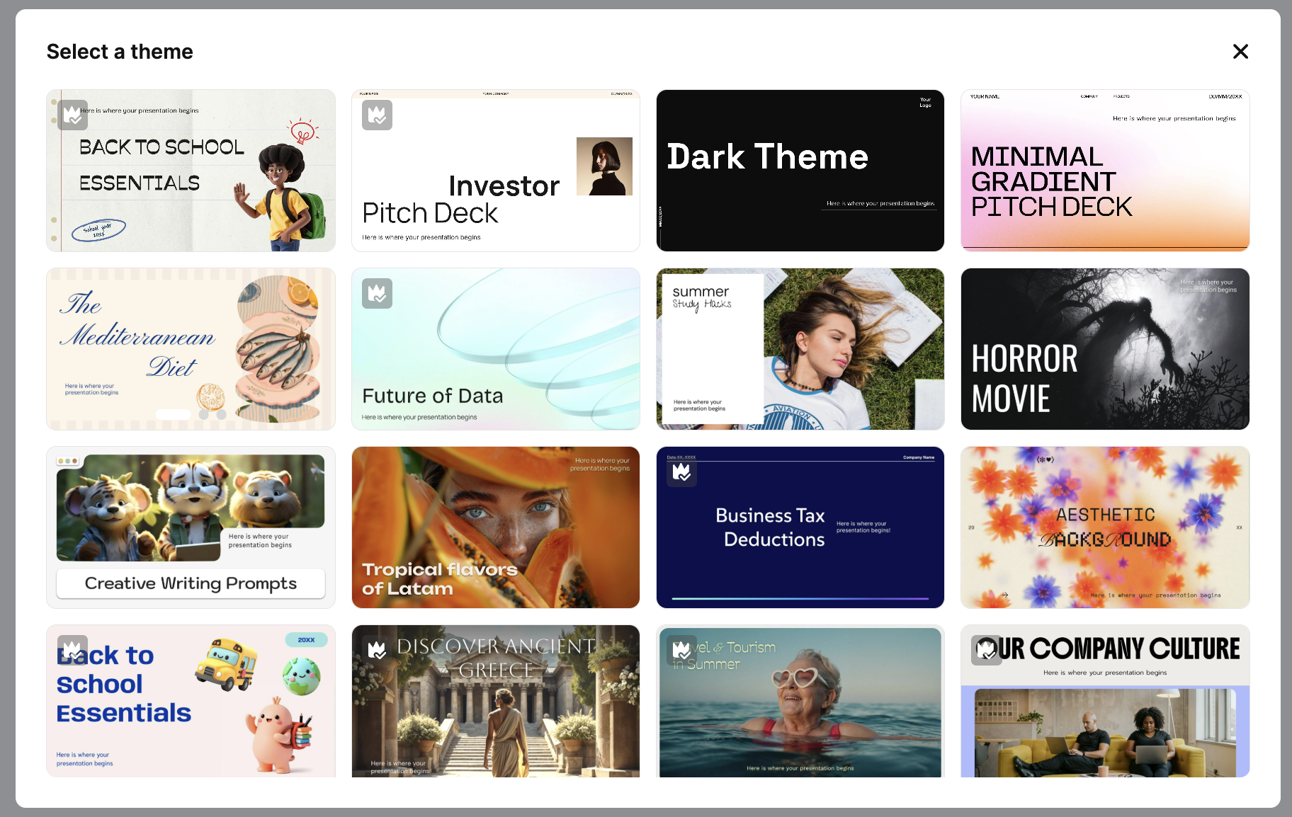 Nuestros diseños de presentaciones son conocidos en todo el mundo, y con razón. Ahora que has elegido un estilo de imágenes, selecciona un tema que encaje con tu contenido. Se aplicará automáticamente, incluyendo las fuentes, los colores y las composiciones. ¡Lo más difícil del proceso es elegir!